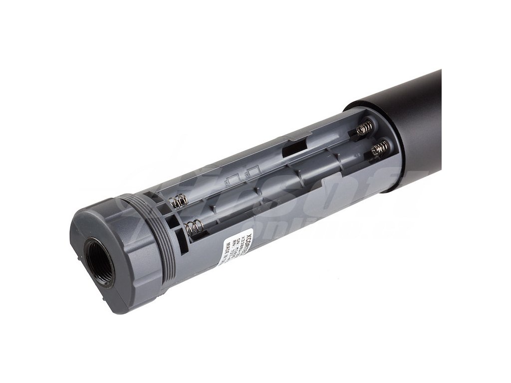 Hliníkový tlumič s integrovaným tracer nasvětlováním se montuje na standardní závit 14 mm levotočivý a měří rychlost střel, kadenci a počítá vystřelené kuličky. MOSFET modul umožňuje programovatelnou dávku 2-10 výstřelů a monitoruje napětí baterie s upozorněním na nízký stav. Všechna data se bezdrátově přenášejí do AN/PEQ boxu s LCD displejem a nastavitelným jasem, který se montuje na lištu RIS 22 mm Picatinny. Systém upozorňuje na nízký stav munice i baterie. Energeticky úsporný provoz s automatickým režimem displeje zajišťuje dlouhou výdrž. Tento kompletní taktický systém umožňuje přesné měření kdykoli v terénu a poskytuje unikátní přehled o stavu airsoftové zbraně během hry.