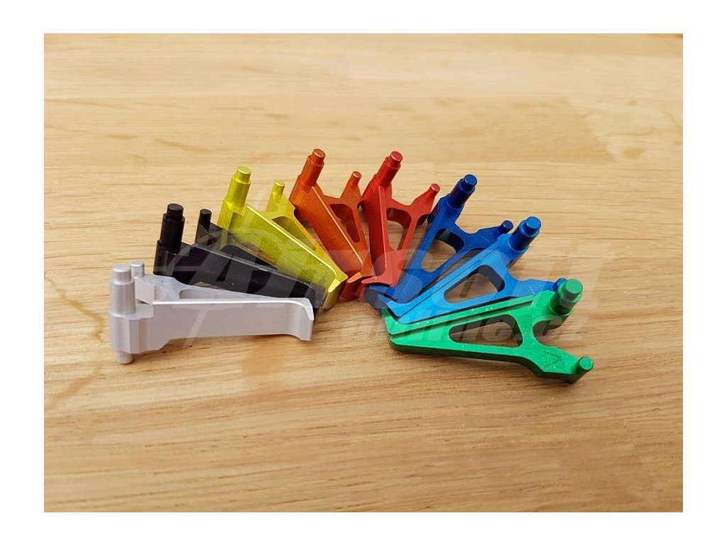 Konverzní rovná spoušť pro airsoftové zbraně AK. Vyrobeno na CNC frézovacím centru z materiálu EN AW 7075. Povrchová úprava dekoračním eloxem.