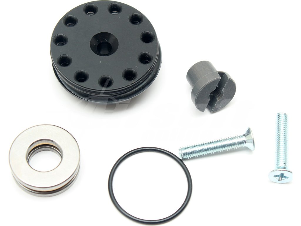 Součástí balení je hlava pístu s nasazeným vodícím a těsnícím o-kroužkem a přibaleným menším vodicím kroužkem pro dosažení maximální kompatibility s válci menších vnitřních průměrů. Dále pak ložisko, příruba ložiska a dva pevnostní šrouby - s imbusovou a křížovou hlavou.