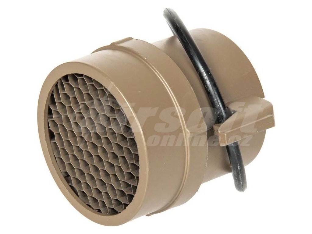 Na optiku drží pomocí přiložené gumičky a není tak třeba šroubovat. Průměr 37 mm zajišťuje kompatibilitu s většinou ACOG kolimátorů. Vyrobena z kombinace polymeru a kovu, hmotnost pouhých 15 gramů. Pískové provedení TAN perfektně ladí s pouštní kamufláží a airsoftovou výstrojí. Ideální doplněk pro taktické střelce, kteří chtějí chránit svou investici do optiky a zamezit taktickému prozrazení pozice.