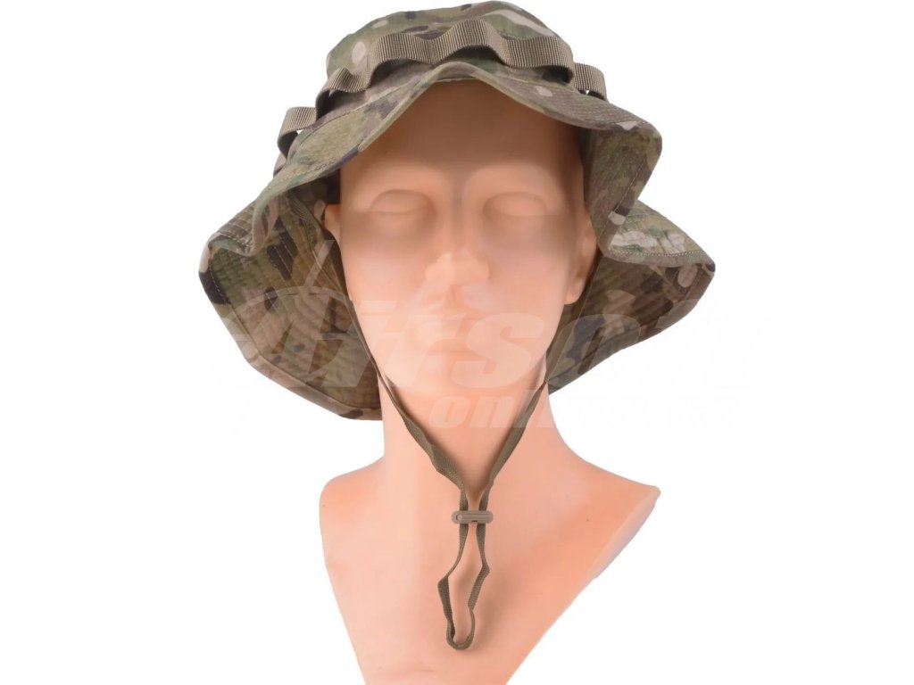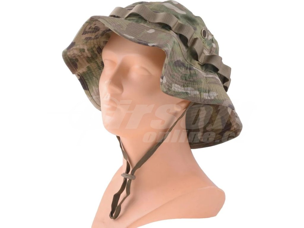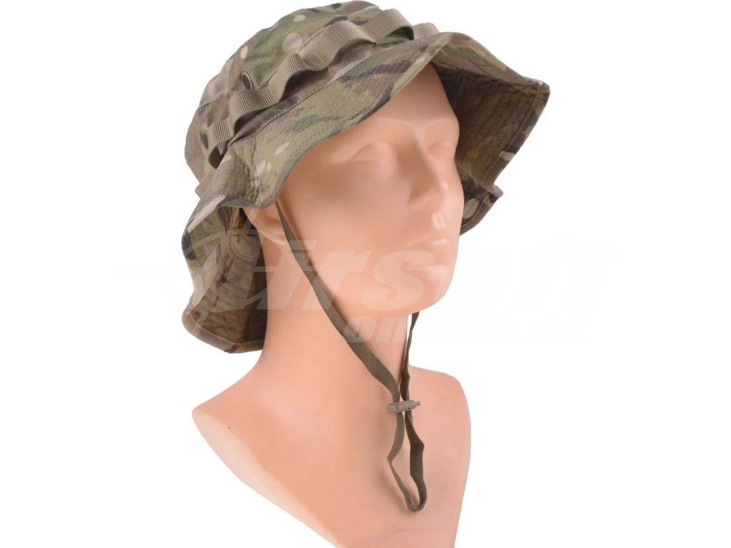 Vyroben z odolné směsi bavlny a polyesteru s výpletem Rip-Stop, která zabraňuje roztrhání materiálu i po lokálním poškození. Obvod klobouku lze stahovat pomocí gumy pro přesné přizpůsobení velikosti hlavy. Po obvodu jsou našita oka pro upevnění maskování jako je tráva, listí nebo další vegetace pro lepší maskování v terénu. Klobouk lze bezpečně upnout stahovacím řemínkem pod bradou a po stranách má větrací otvory pro lepší prodyšnost. Na vrcholu je suchý zip pro připevnění nášivek. Maskování MultiCam je univerzální pro různá prostředí.