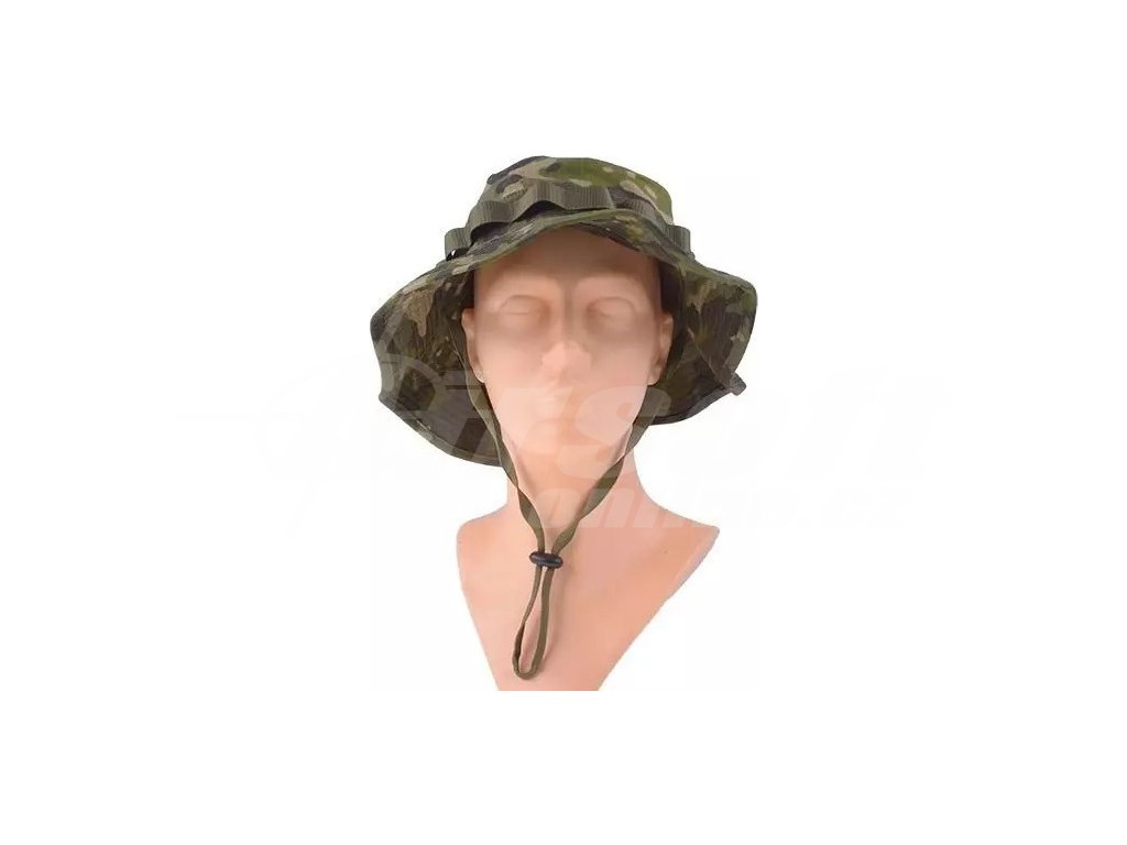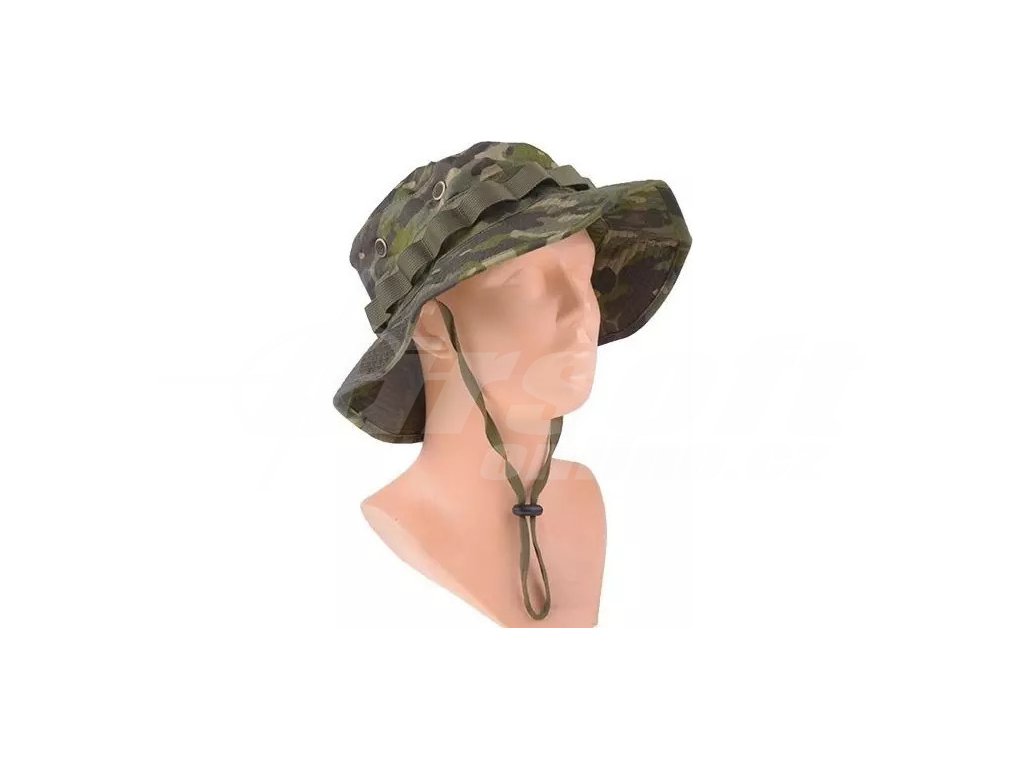 Vyroben z odolné směsi bavlny a polyesteru s výpletem Rip-Stop, která zabraňuje roztrhání materiálu i po lokálním poškození. Obvod klobouku lze stahovat pomocí gumy pro přesné přizpůsobení velikosti hlavy. Po obvodu jsou našita oka pro upevnění maskování jako je tráva, listí nebo další vegetace pro lepší maskování v terénu. Klobouk lze bezpečně upnout stahovacím řemínkem pod bradou a po stranách má větrací otvory pro lepší prodyšnost. Na vrcholu je suchý zip pro připevnění nášivek. Maskování MultiCam Tropic je ideální pro tropické a husté vegetační prostředí.