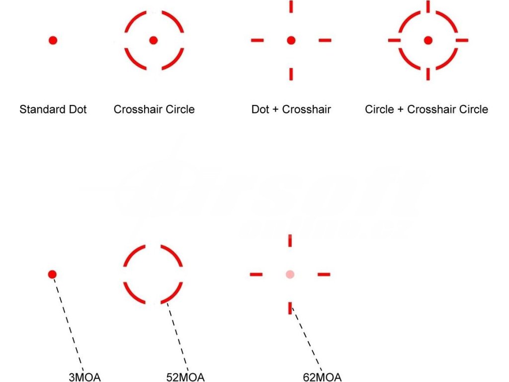- Záměrné body: 3 MOA tečka, 52 MOA kruh, 62 MOA kříž (a jejich kombinace)