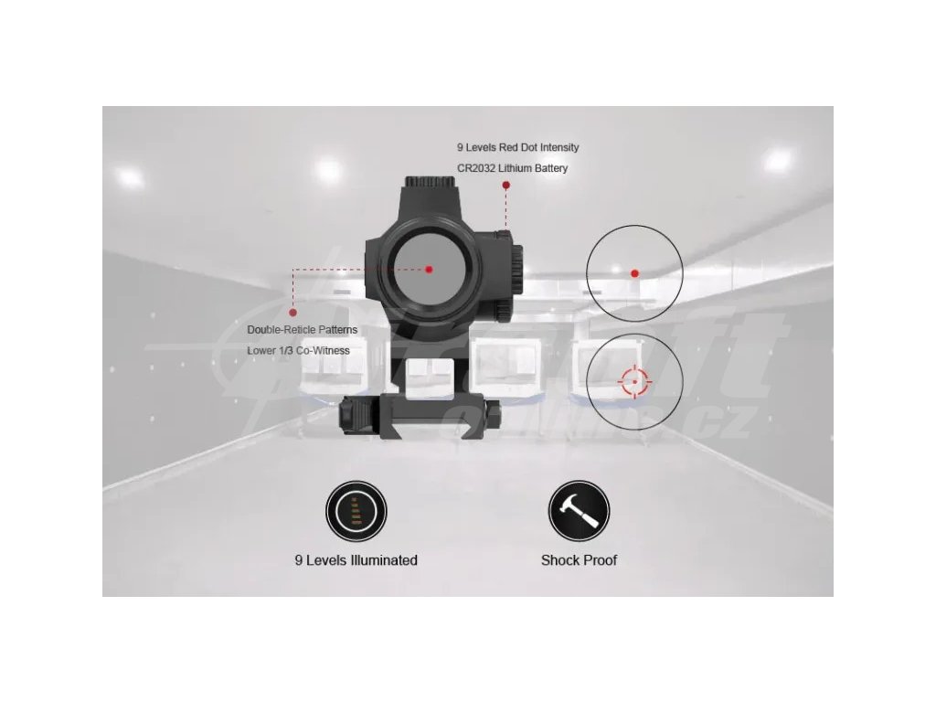 - Záměrné obrazce: 3 MOA tečka / kříž s kruhem a tečkou (přepínatelné)