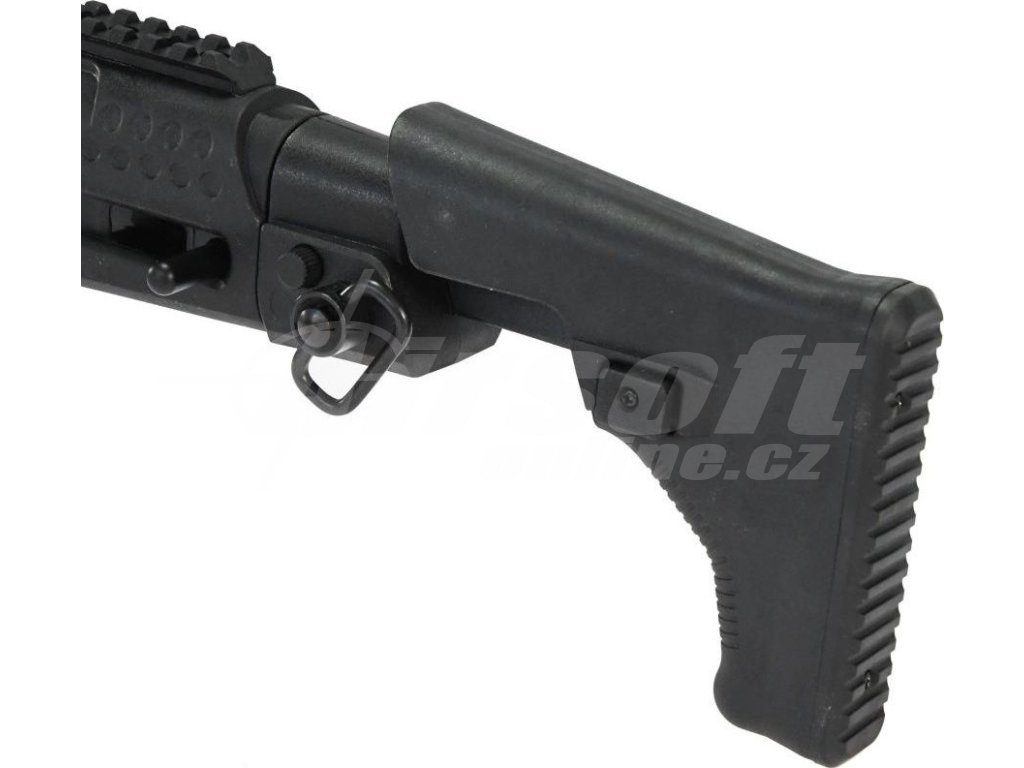 - Pažba: teleskopická pažba s možností nastavení délky pro přizpůsobení tělesné postavě a pohodlnému opření lícnice.