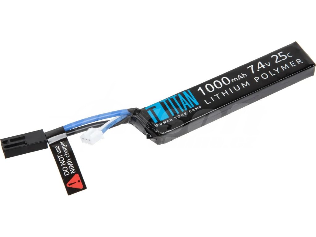 Díky napětí 7,4V a kapacitě 1000 mAh se hodí pro kratší až středně dlouhé akce. Konektor Mini Tamiya zajišťuje jednoduché a rychlé připojení ke standardní kabeláži většiny AEG replik. Pro dlouhou životnost je důležité používat pouze Li-Pol nabíječky a vyhnout se podbití či mechanickému poškození.