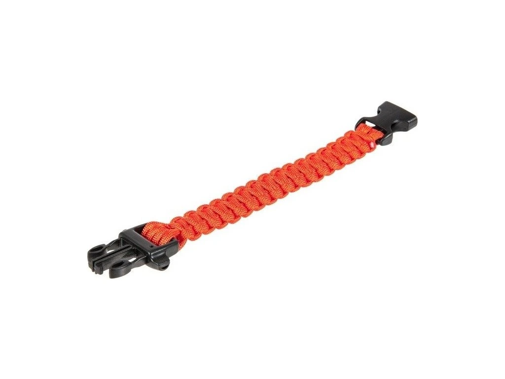 Náramek z pleteného paracordu. Je vybaven odolnou polymerovou sponou s integrovanou hlasitou píšťalkou.