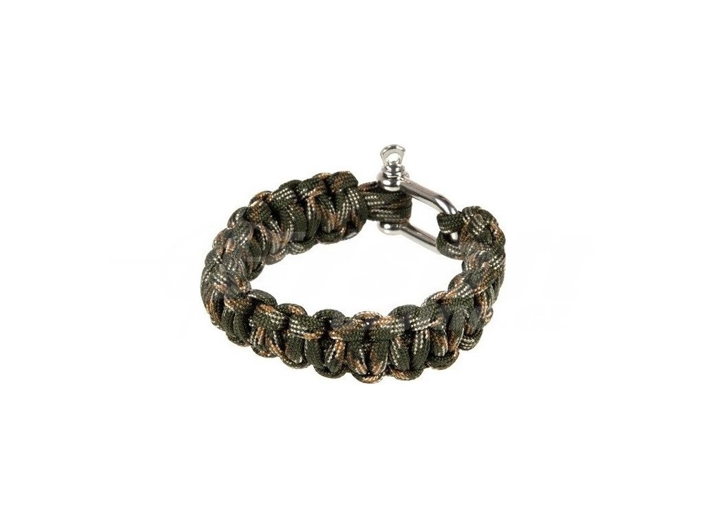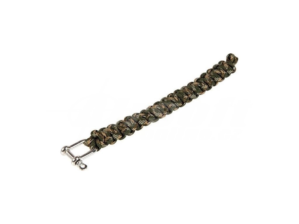 Náramek z pleteného paracordu. Je vybaven zapínáním ve formě odolného kovového okovu.