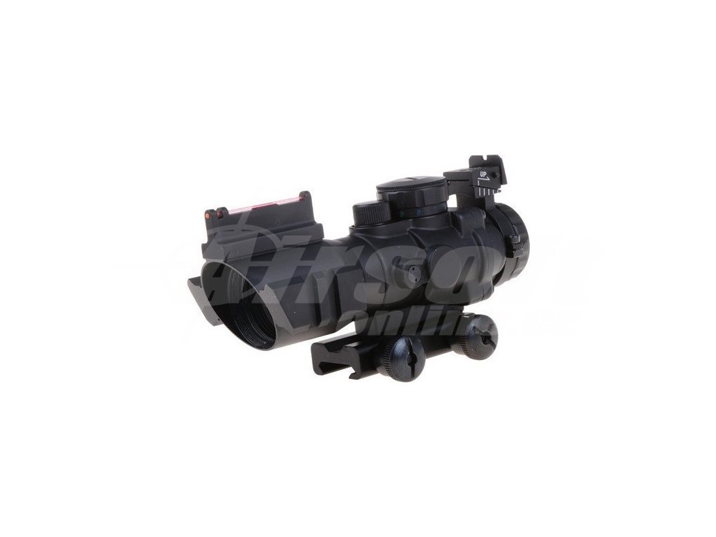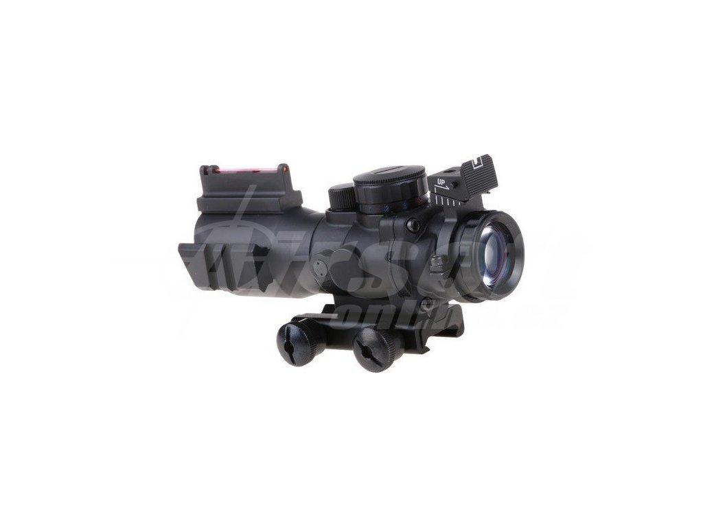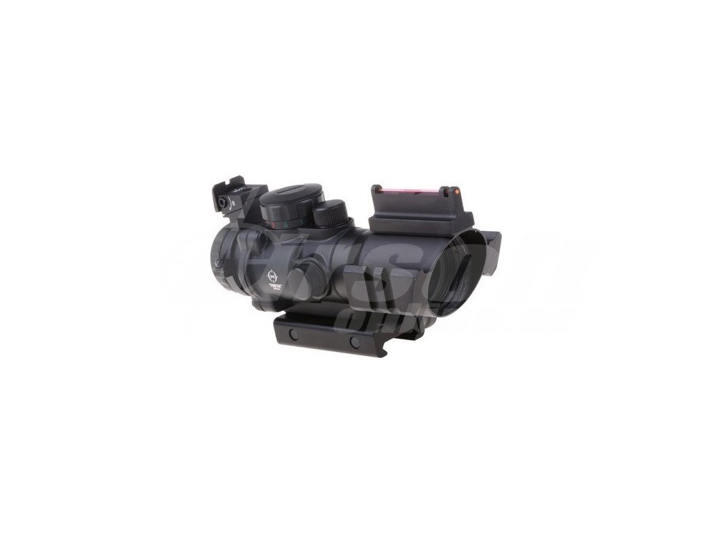 Optika Rhino 4x32 Theta Optics – Multifunkční airsoft puškohled s pevnými mířidly a trojbarevným přísvitem