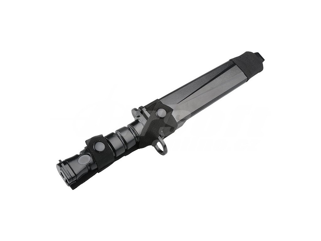 Rukojeť se žebrovanou strukturou poskytuje stabilní úchop i v náročných podmínkách. Základna rukojeti je vybavena montáží pro airsoft repliky M4 a M16, což umožňuje připevnění nože přímo na zbraň. V balení je zahrnuto pevné pouzdro typu kydex vyrobené z polymeru s upevněním na opasek nebo Molle vazbu. Ideální pro airsoft trénink a simulace na www.airsoft-online.cz.