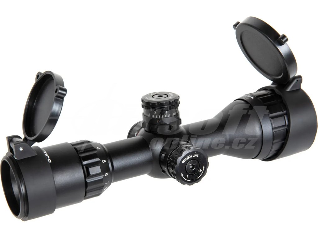 Odolná hliníková slitina garantuje extrémní mechanickou odolnost při hmotnosti pouhých 385 gramů, zatímco vodotěsná konstrukce a náplň suchým dusíkem chrání optiku před zamlžením při náhlých změnách teplot. Vícevrstvá úprava čoček zajišťuje výborný přenos světla a jasný obraz. Stavitelné věžičky se slyšitelným kliknutím poskytují precizní výškovou a stranovou korekci 120 MOA s posuvem po 1/4 MOA. Nastavitelná paralaxa od 3 yardů do nekonečna a kompenzace dioptrií +2 až -2 umožňují individuální přizpůsobení. Tubus 25,4 mm zajišťuje kompatibilitu se standardními montážemi. Puškohled je testován na nárazy do 750 g a je odolný do ráže AR .223 5.56, což z něj činí ideální volbu nejen pro airsoft, ale i pro ostré zbraně. V balení naleznete montážní kroužky 25,4 mm a kompletní příslušenství pro okamžité použití na vaší airsoftové replice.