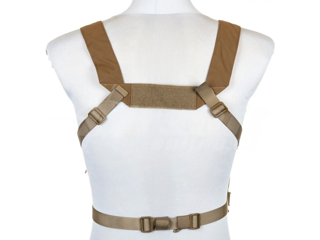 Základ tvoří prémiový textil CORUND™ 500D, který se vyznačuje dlouhou životností a schopností odolávat náročným podmínkám terénních her. Pískové TAN zbarvení zajišťuje efektivní maskování v suchých a pouštních prostředích, ale zároveň funguje jako neutrální barva kombinovatelná s další výstrojí. Chest rig je vybaven ergonomickými H-popruhy s plynulým nastavením, které garantují rovnoměrné rozložení zátěže na těle. Přední plocha se suchým zipem slouží k umístění identifikačních prvků, zatímco zadní velcro systém otevírá možnost integrace s nosiči taktických plátů pro komplexnější ochranu.