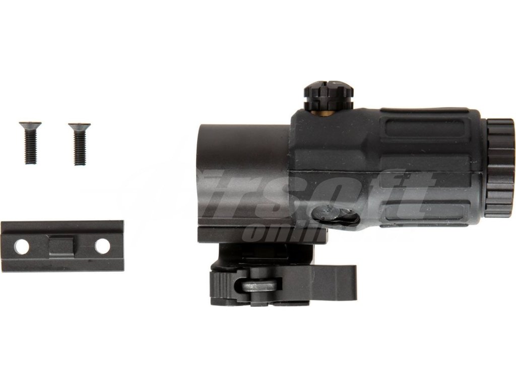 Pevné zvětšení 3x umožňuje přesné zásahy na střední až delší vzdálenosti, zatímco boční výklopný držák zajišťuje okamžité přepnutí mezi normálním mířením a zvětšením podle aktuální situace na airsoftovém bojišti. QD montáž umožňuje rychlou instalaci na standardní 22mm lištu RIS/Picatinny, takže můžete magnifier snadno nasadit na vaši airsoftovou zbraň. V balení naleznete i zvýšenou montáž pro různé typy konfigurací. Vertikální a horizontální nastavení zajišťuje dokonalé sladění s vaším kolimátorem. Robustní konstrukce z kovu garantuje dlouhou životnost. Ideální kombinace s další taktickou výstrojí jako jsou komunikační systémy, PTT tlačítka, produkty Earmor nebo Z-Tactical pro kompletní profesionální vybavení.